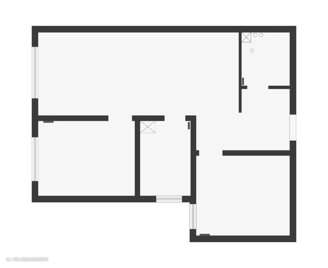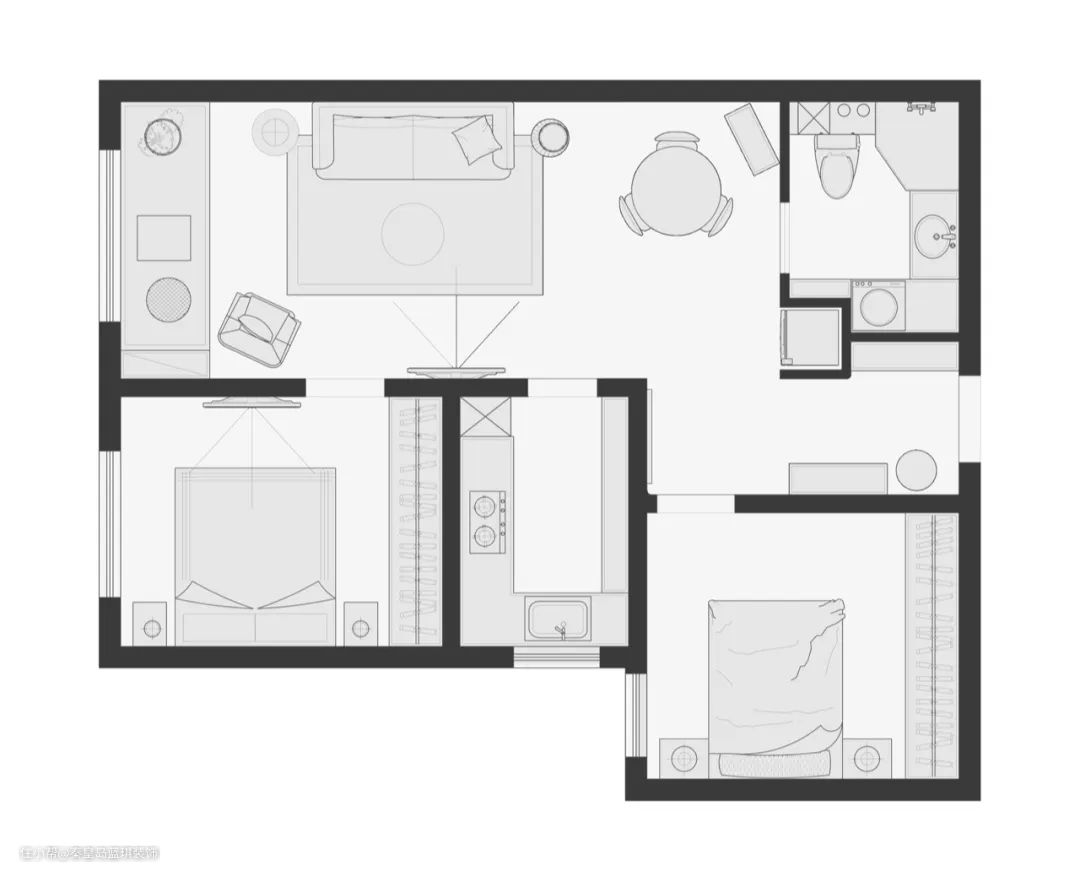 原始结构图这是一套常规的两居户型,存在卫生间太小;门厅做不了鞋柜;主卧储物少;客餐厅过于狭长等问题。