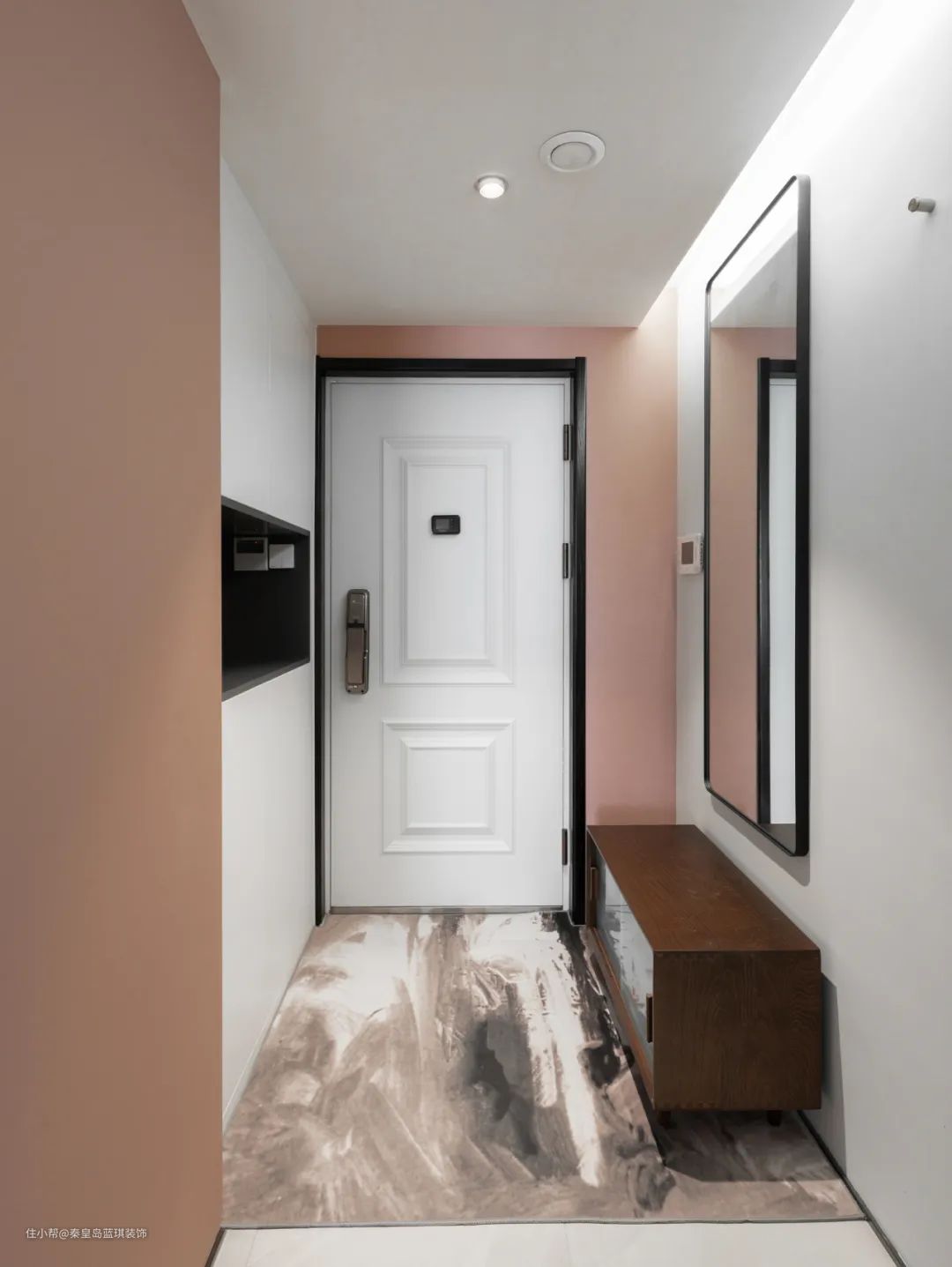 因为门厅无自然采光,所以选了猛男最爱的脏粉色,搭配白色的柜子,色调明快干净。入户门装了电子猫眼,链接WiFi绑定手机,非常方便。