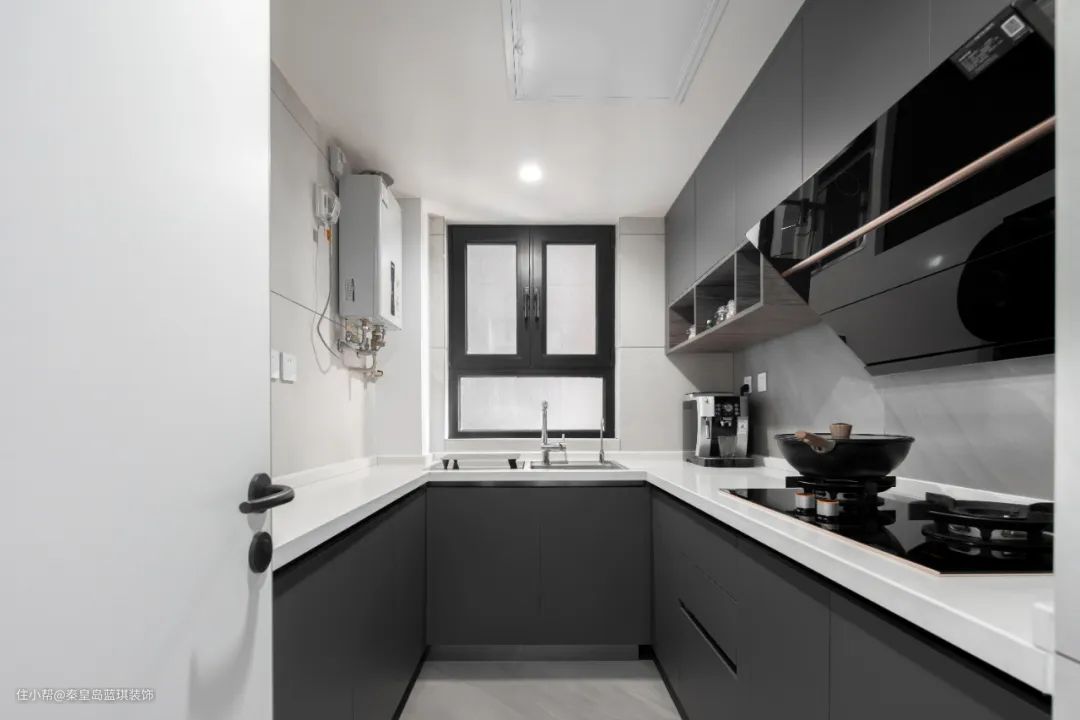 厨房墙面用的是浅米色瓷砖,搭配深灰色橱柜,整体干净整洁,优雅大气。左侧因为宽度限制原因做了一排窄柜,台面延伸过来,整体性很高。