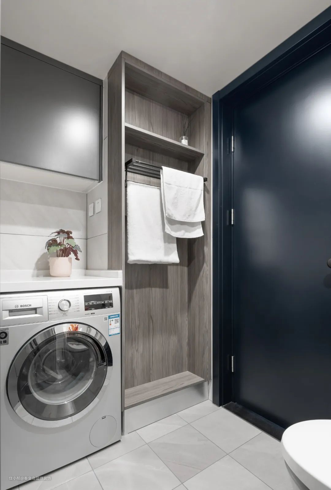 1、原本被安排在门厅的洗衣机挪到卫生间内部,卫生间扩大,门厅增加鞋柜,角落内嵌冰箱;