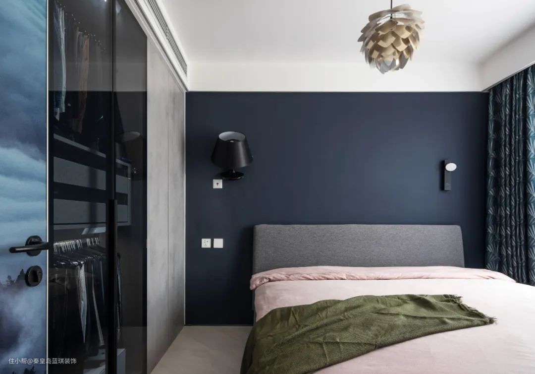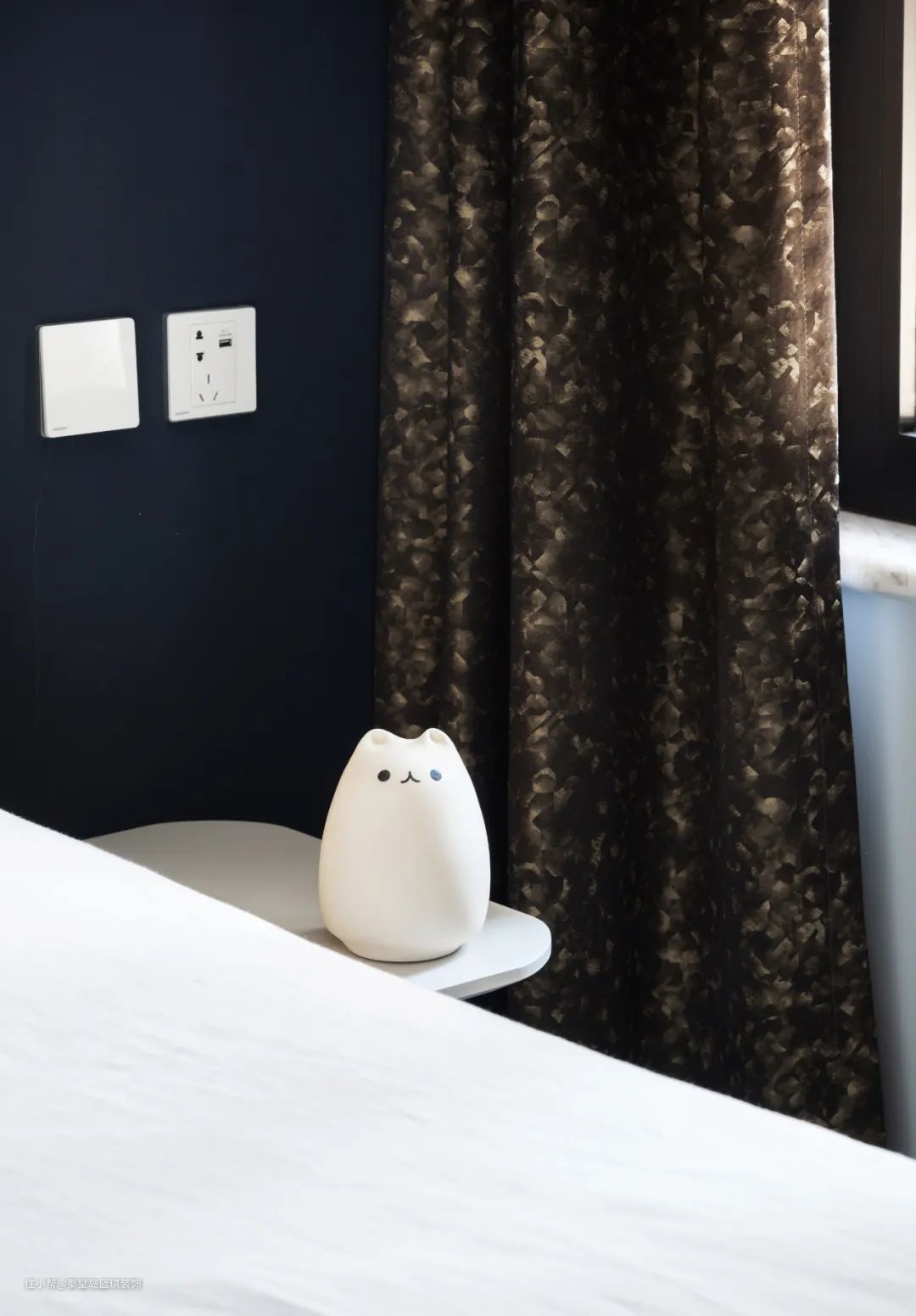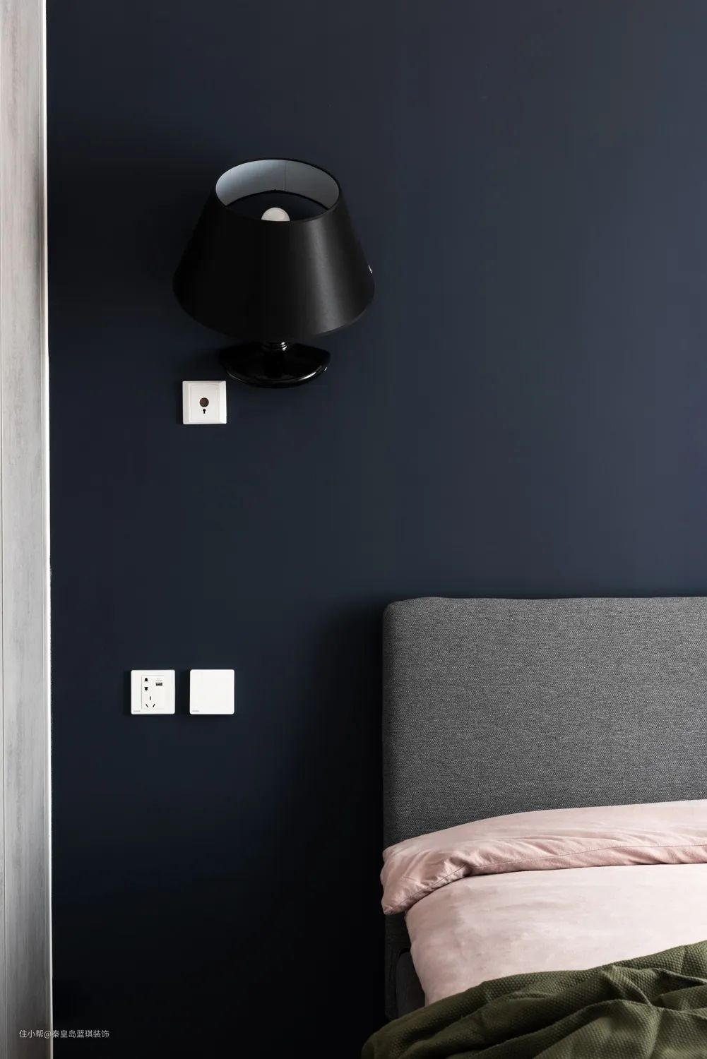 卧室因为满墙刷漆,造型比较干净,所以选择了一款有点小复古的壁灯。设计感很强,光源通过灯罩反射到墙面,形成比较舒服的光感。卧室门选择的是tata的画布门,装饰性很强。