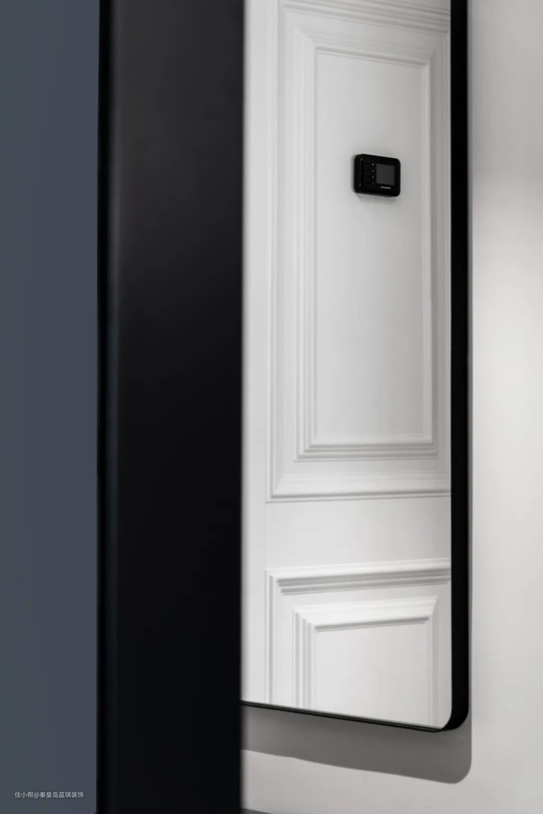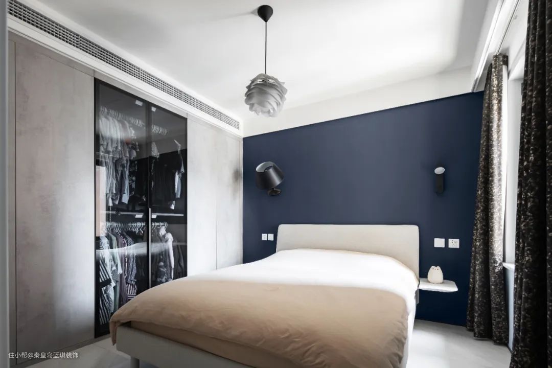 主卧的门移了后,做了满墙衣柜,衣柜中间两扇门做了玻璃门,给整个空间增加一些镜面质感,若隐若现的反射也起到一些拉伸空间的作用。