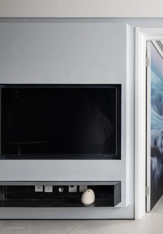 电视墙整体刷了淡淡的灰蓝色,和整体呼应又不突出。电视柜是定制的,表面颜色有点像黑色水磨石,很有质感。