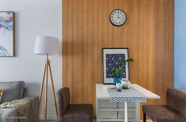 一张可折叠的餐桌搭配两个布艺软包的椅子,平时不用餐厅的时候就把它给收起来吧!墙面的木质造型让这个餐厅看起来更有格调。
