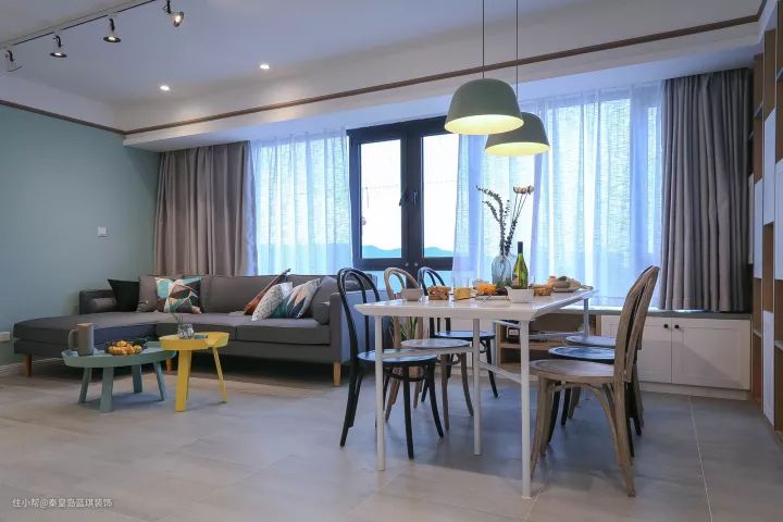 餐厅和客厅结合在了一起,用一个长卡座来代替沙发,把餐桌椅放在更靠近窗户的地方,这样吃饭的时候也会有更好的心情。