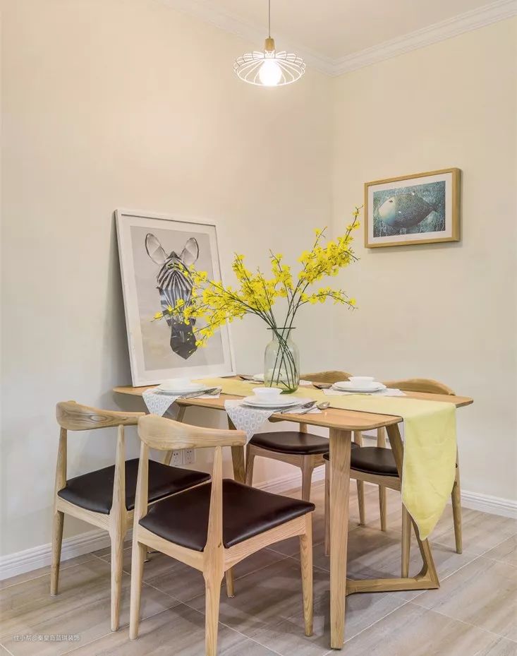 原木风的餐桌椅搭配干花和装饰画,再加上简洁好看的吊灯,在暖色调墙面的衬托下,这样餐厅的面积并不大,但给人一种温馨又舒适的感觉。