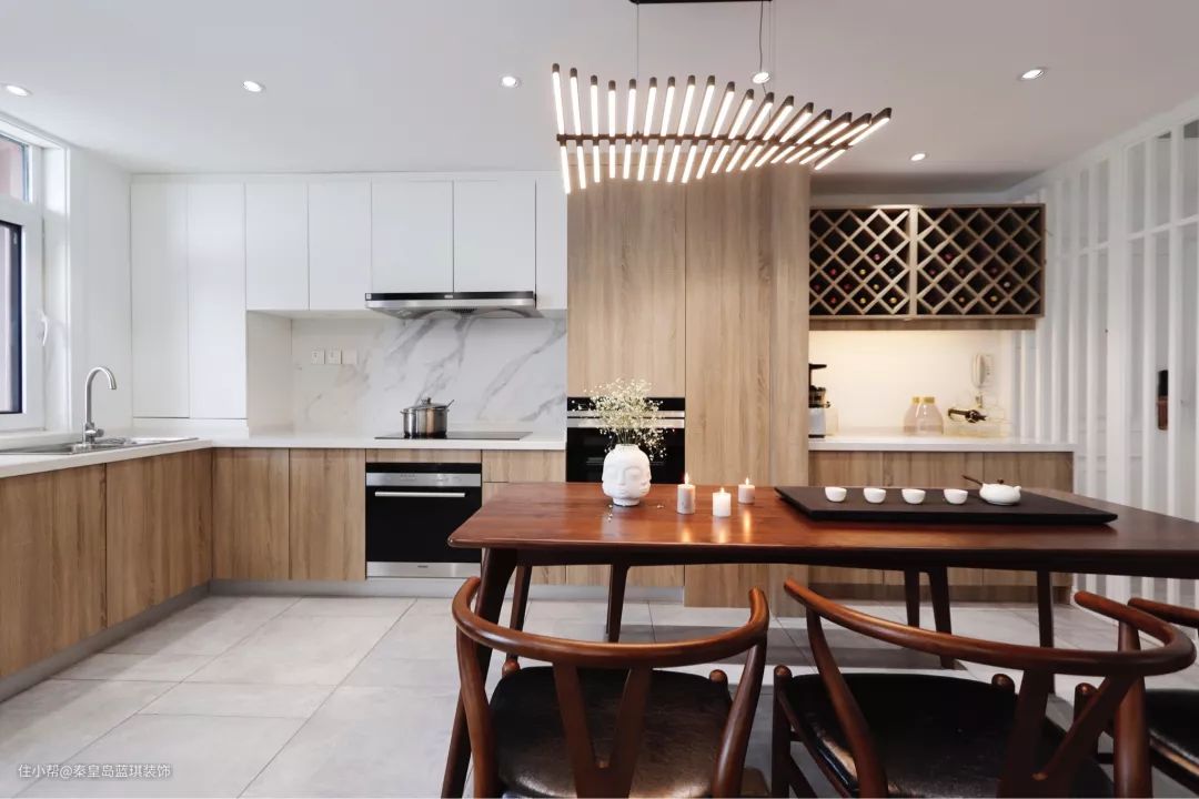 或者直接把餐桌椅给摆放在厨房内,两个空间合在一起,看起来就宽敞了不少。这个餐厅上方的吊灯款式非常有趣,真好看呀~