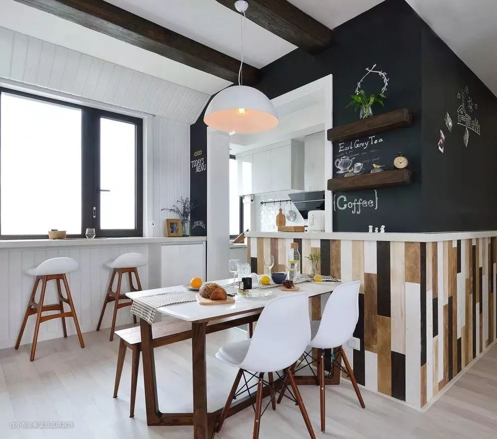 墙面上下分割,复古地板作为墙裙,原始而纯粹。上层墙面打造成了文艺气息十足的黑板墙,随时随地都可以涂鸦,巨显格调。