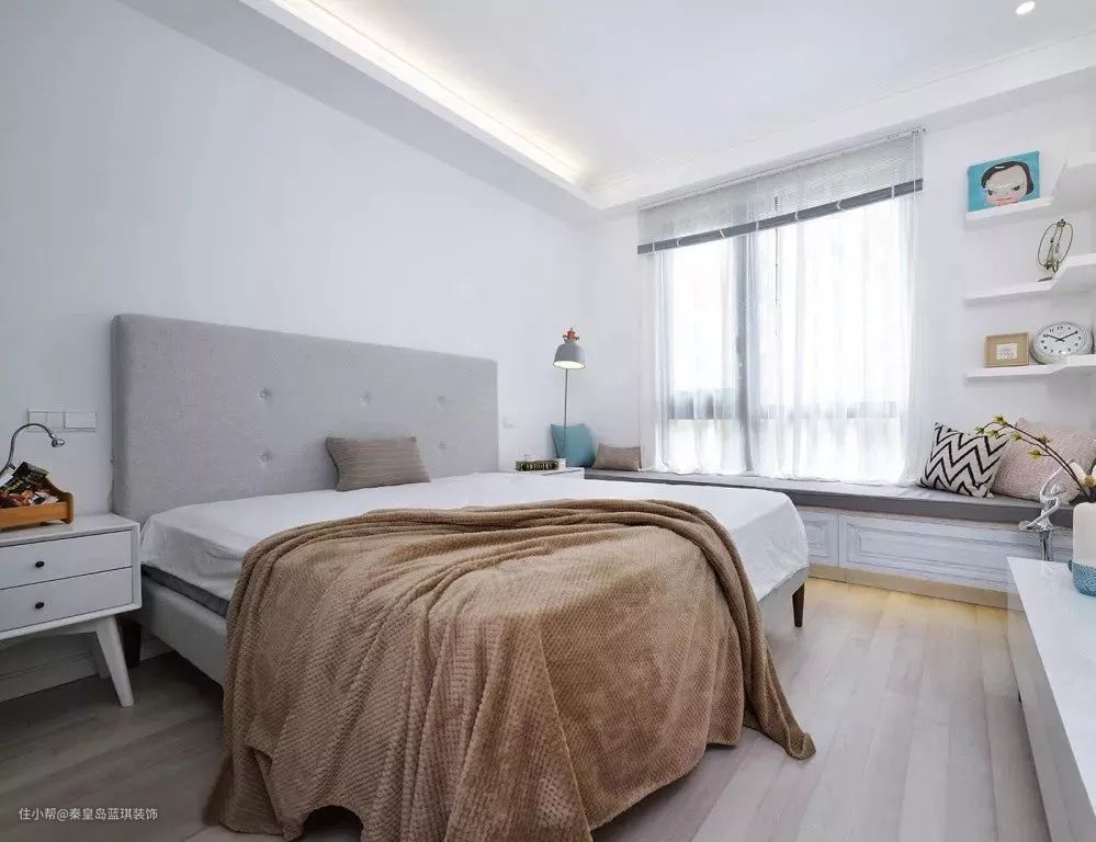 卧室以白色为主调,浅灰色布艺大床简约而舒适,咖啡色盖毯搭在床脚,轻松又随意。飘窗下方设置了整排的收纳柜,不仅十分美观,更具备了实用性功能。