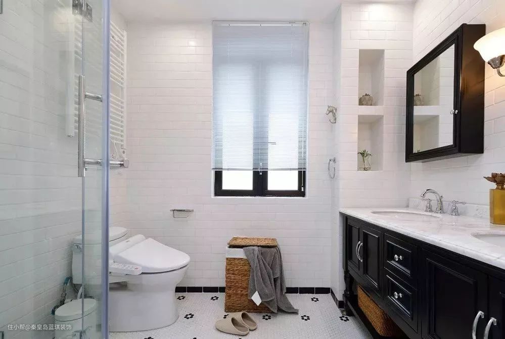 卫生间以黑白两色为主调,干净纯粹的墙面搭配宜家风格的纯黑色大浴室柜,洋溢浓郁的北欧气息,实用又美观。