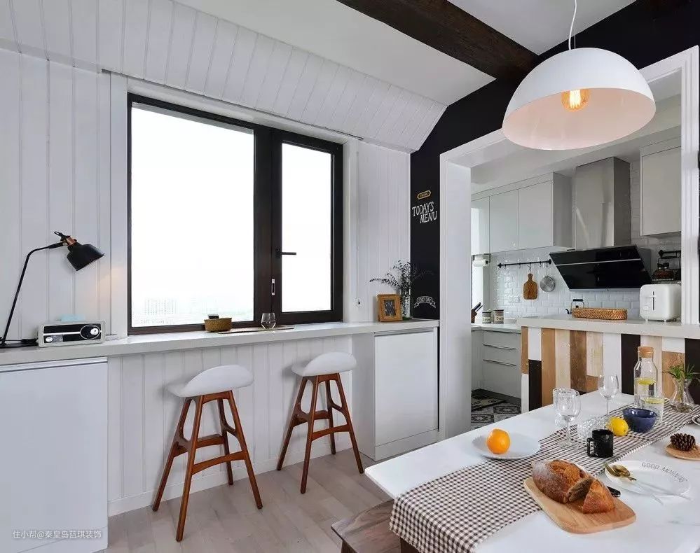 厨房和餐厅之间也设置了一个白色小吧台,吧台功能性很强,既可以作为简单的操作区,也能作为菜品放置区。