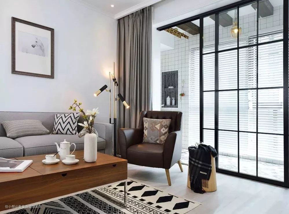客厅和阳台之间采用黑白玻璃移门分割空间,使空间更加明亮通透。