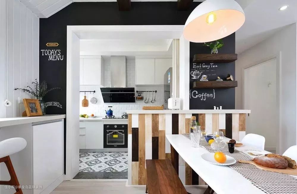 墙面上下分割,复古地板作为墙裙,原始而纯粹。上层墙面打造成了文艺气息十足的黑板墙,随时随地都可以涂鸦,巨显格调。