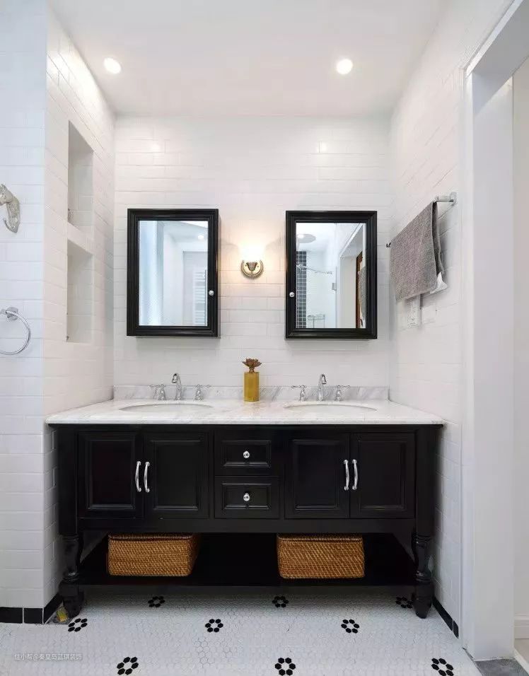卫生间以黑白两色为主调,干净纯粹的墙面搭配宜家风格的纯黑色大浴室柜,洋溢浓郁的北欧气息,实用又美观。