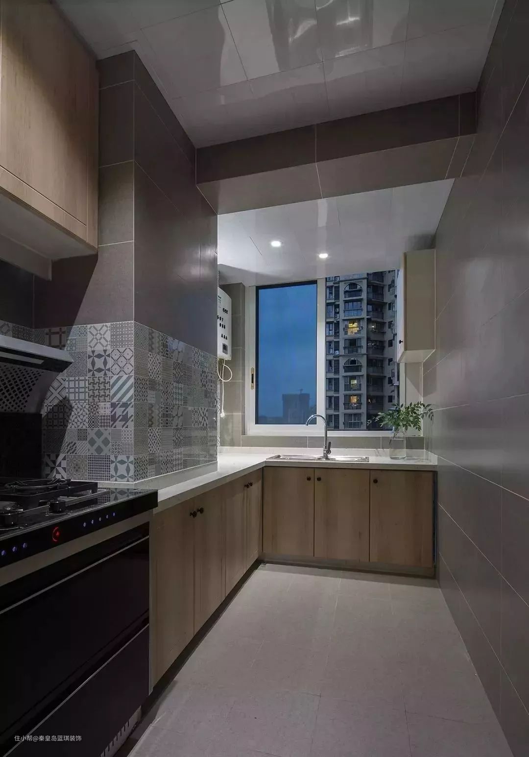 厨房内部是以灰色和木色为主,营造出一个轻松而又舒适的氛围。厨房内的橱柜做了L形的布局,在墙面加入了花砖作为点缀,显得更为美观。
