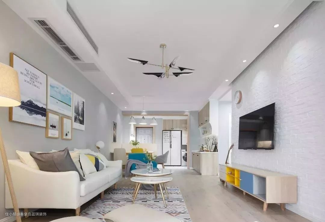 而客厅的电视背景墙是做了白色的文化砖造型,家里的柜子都是选择了更为清新的浅木色,和北欧风可以更好的融合起来,显得更为简洁。