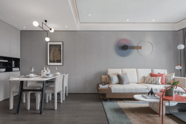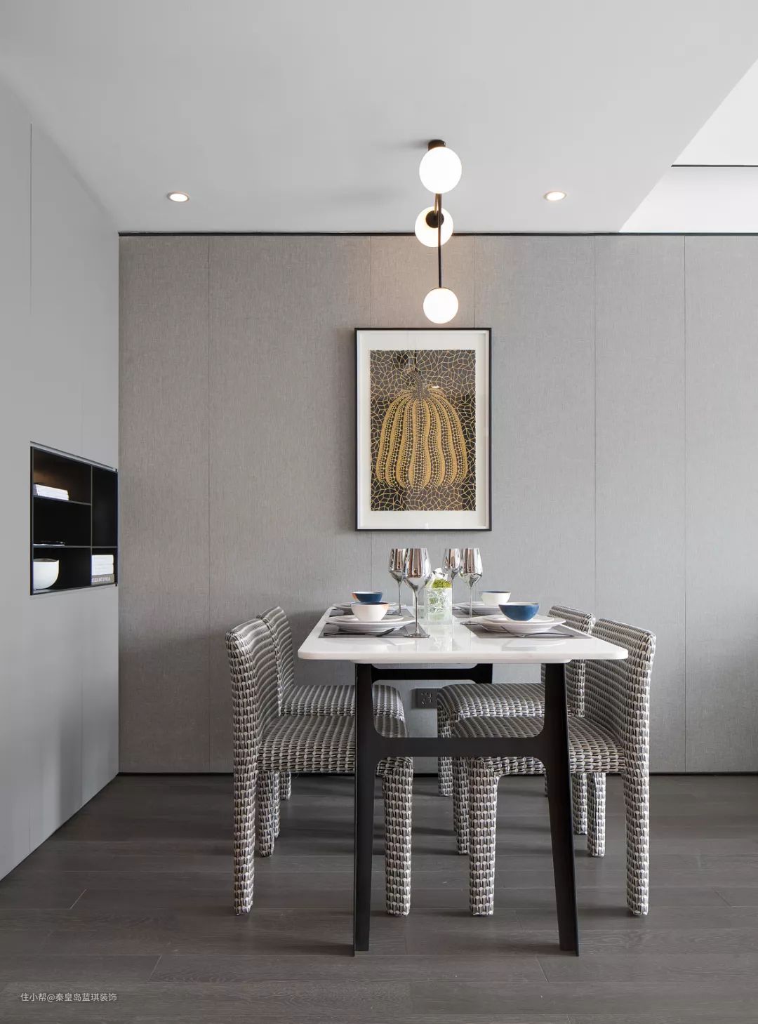 沙发硬包背景一直延伸到餐厅,提升空间的温馨舒适感。入墙式定制柜,满足了入户及餐厅的收纳需求,适当的留空,不会显得过满,时尚而灵动。