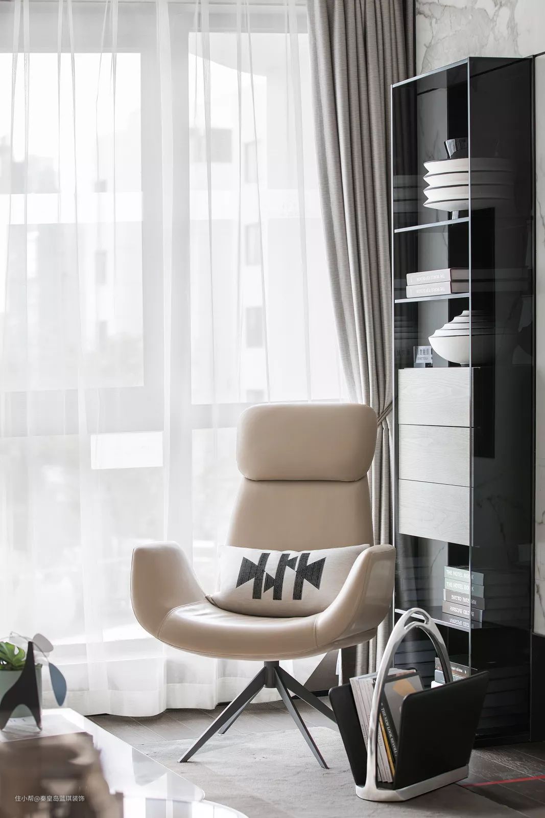 客厅通铺灰色地砖,沙发背景做了灰色硬包,顶面无主灯设计,硬装奠定了空间优雅简约大方的基调。