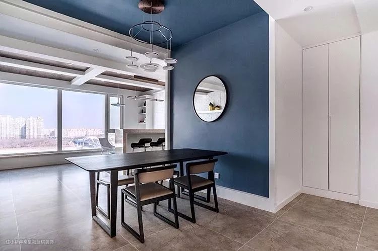 餐厅背景墙也是以雅蓝色为主,中间挂上一个圆形的镜子,搭配上禅意端庄的大餐桌椅,还有一套独特的盘状吊灯,显得优雅而高档。