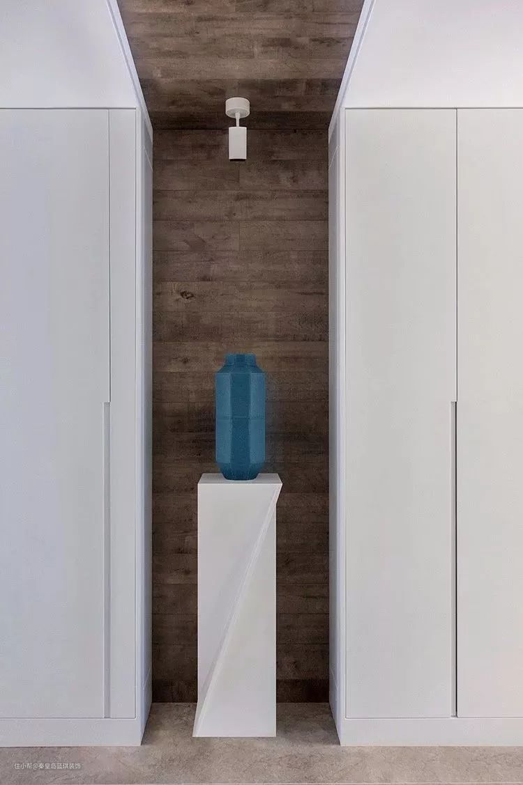 玄关进门后做了一个壁龛造型,摆上一个端景架,摆上一只蓝色的花瓶并在顶上装一盏射灯,整个空间都显得格外的温馨精致。再往里则是通顶的收纳柜,白色的柜体也让空间显得更加的简约现代。