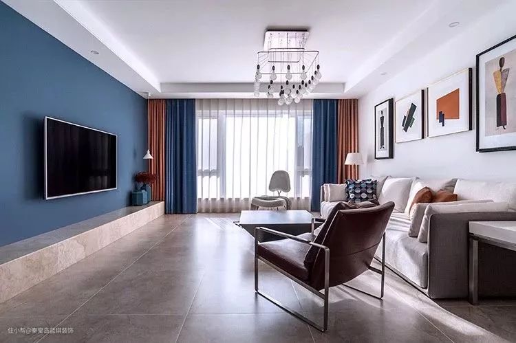 客厅以年轻的现代简约风格基础搭配,蓝色电视墙搭配硬装砌的电视柜台面,以壁挂的电视机,整体显得格外的简约大方。