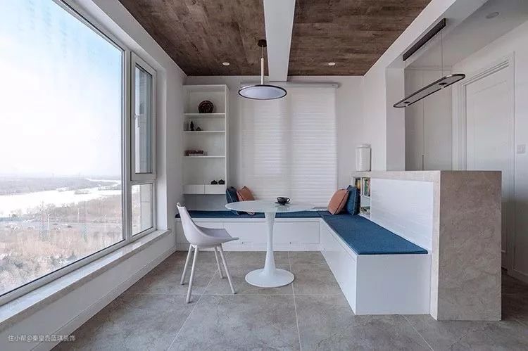 休闲区与餐厅之间装一个吧台,吧台后靠在安装的卡座,垫上蓝色的坐垫,搭配白色的整体家居氛围,在窗外的景色烘托下,一个宁静安详的空间,坐在这里你可以感受到满满的放空。