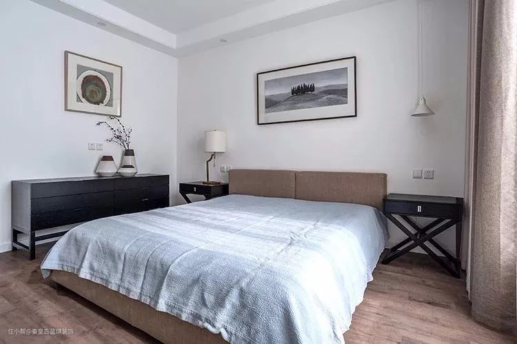 卧室空间同样在简约为主,木地板+简洁的墙面,还有一张灰色的床单,搭配上黑色的床头柜与斗柜,还有禅意极简的软装点缀,细节散发着一丝舒适惬意的气息。