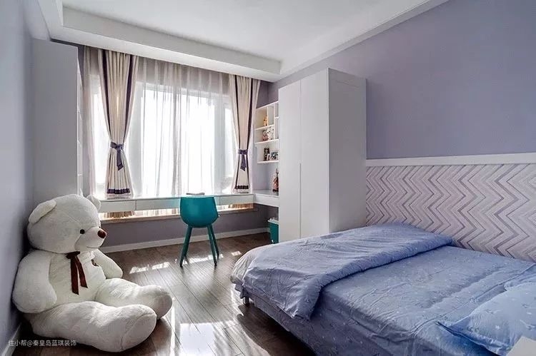 儿童房在淡淡的蓝紫色为基础下,墙脚部分是波浪纹的护墙板,配上一套淡蓝色的床单,还有一只大公仔,充满了轻松惬意的气息。