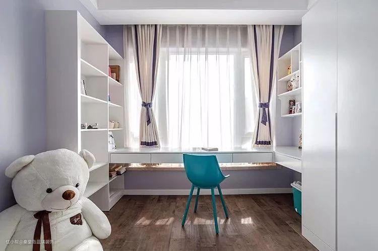 靠窗位置安装一个书桌与书柜,隔着飘窗腾出宽松的窗户,让空间透气而舒适。
