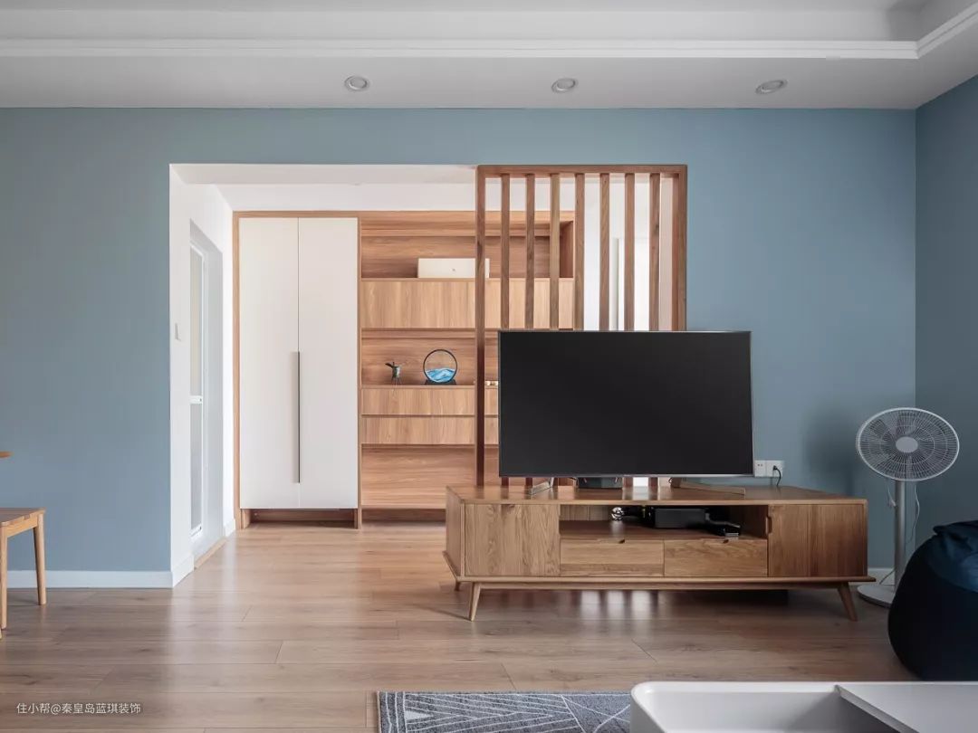 电视墙打掉一半做成木质屏风,使采光较差的客厅更加自然明亮。搭配上木质电视柜,呈现出一个宽敞自然的电视墙,简约舒适又大方。