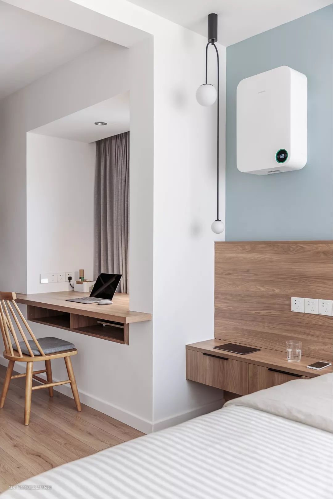 定制一体的床头柜做到了靠墙位置,带来实用自然的空间感顶上的北欧风吊灯,也增添了空间的文艺舒适感。