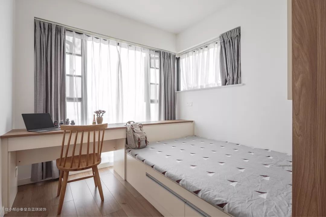 儿童房的空间非常的紧凑,靠窗的书桌延伸到床头位置,延伸到床头的书桌台面,则可以充当床头柜功能,连贯的设计把这个空间利用得实用舒适好大气。