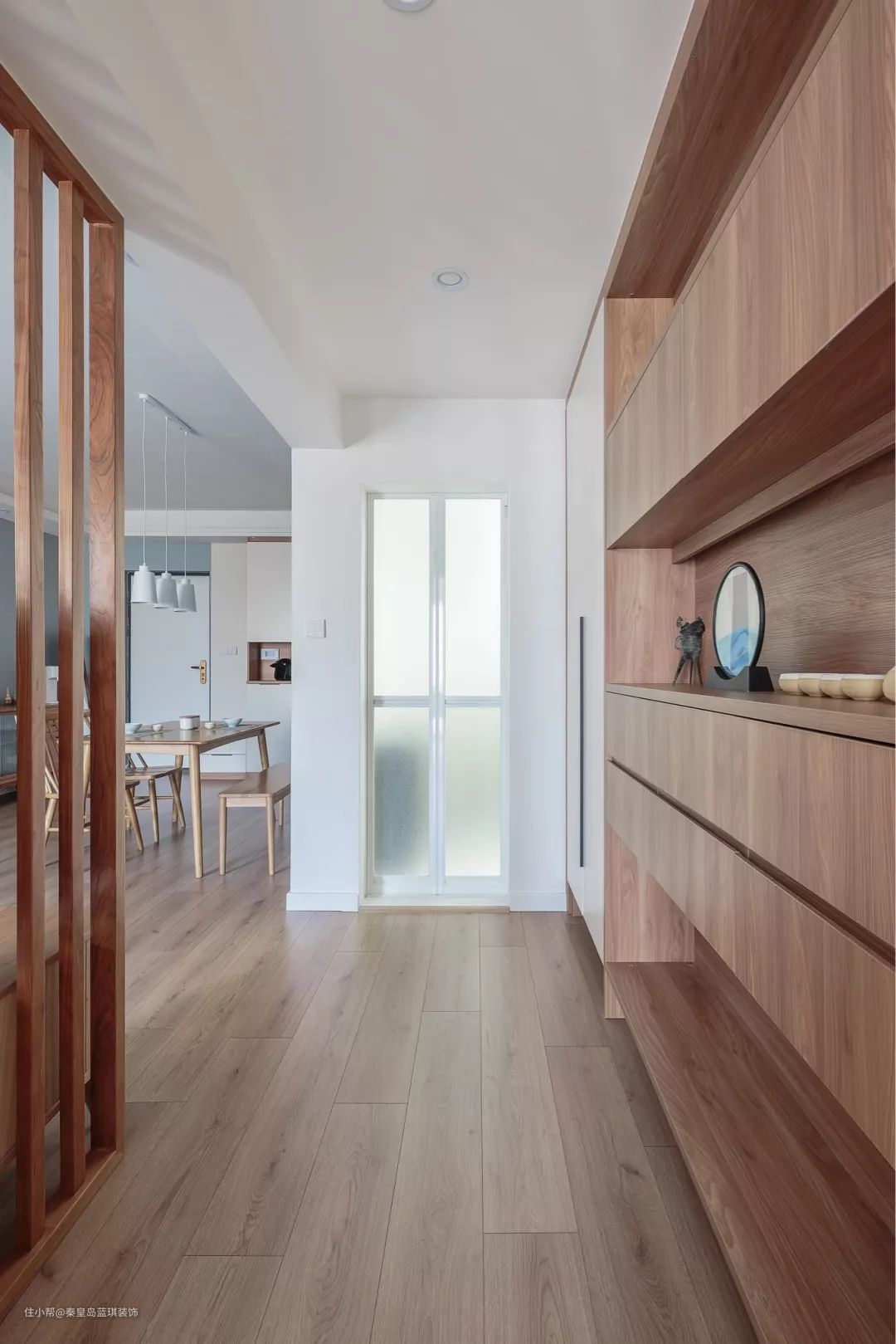 走廊里以原木质感的收纳展示柜,与地面质感保持和谐统一,多层的柜体设计结合了收纳储物与展示层,实用美观两不误。