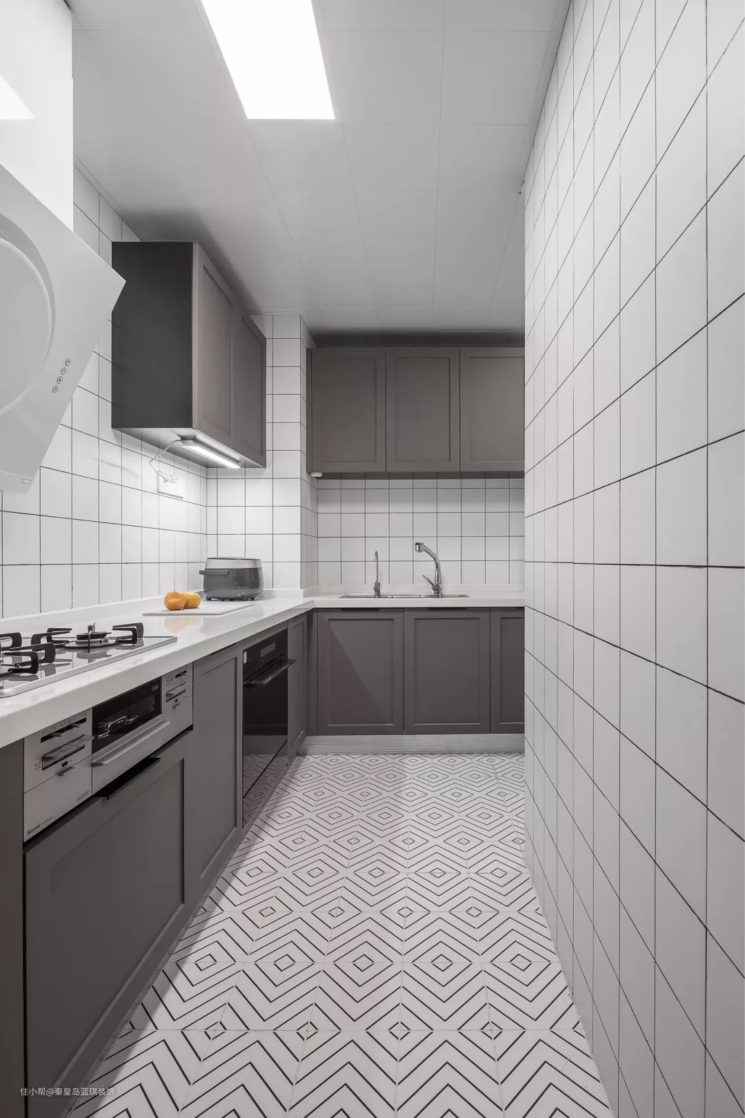 厨房以回字形的地面砖+白色小格墙面砖。搭配灰色橱柜,为主人提供了一个文艺轻松的烹饪空间。