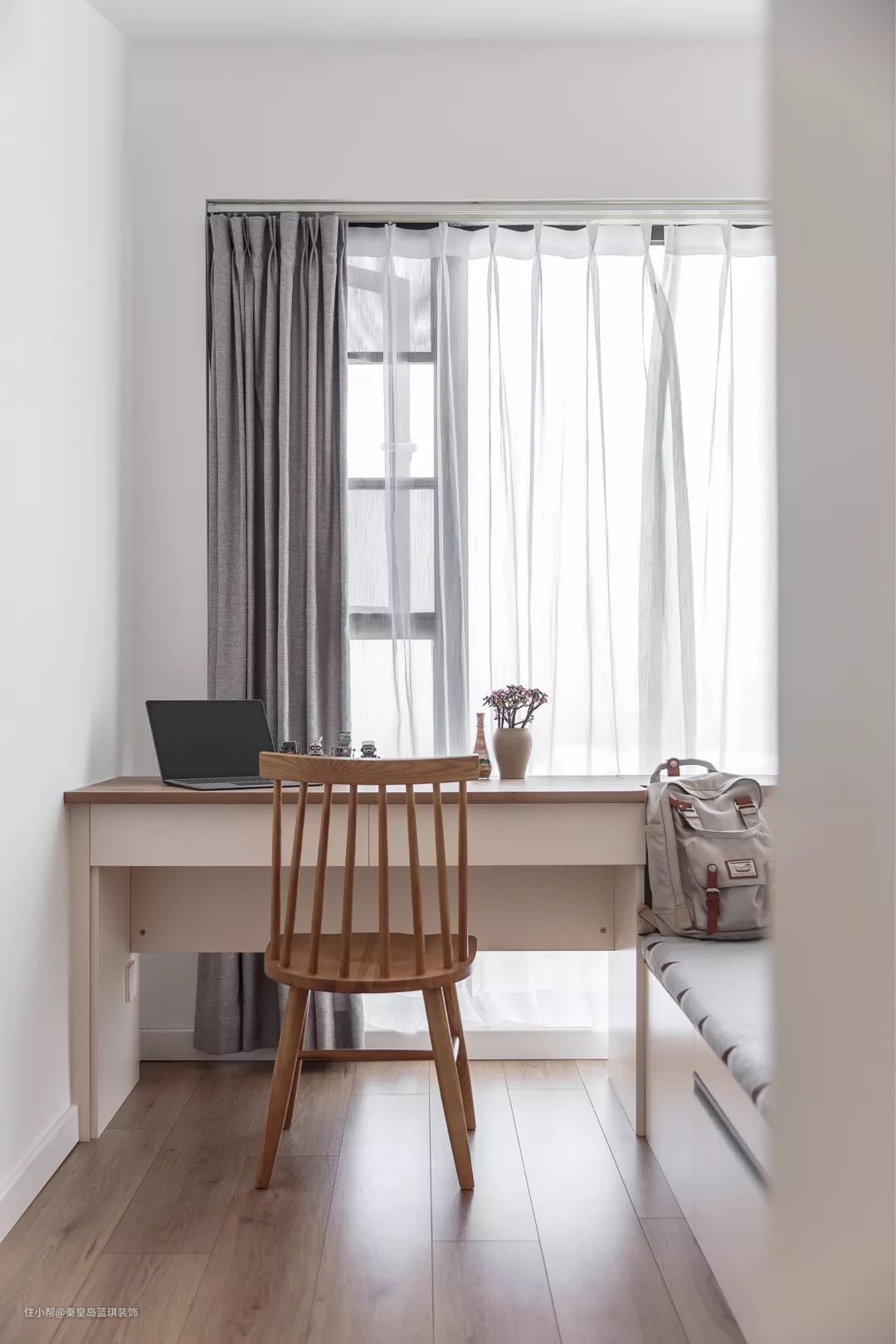 简洁舒适的定制书桌+温莎椅,书桌底部留空让窗户的光线进入卧室,呈现出一个轻松自然的空间质感。
