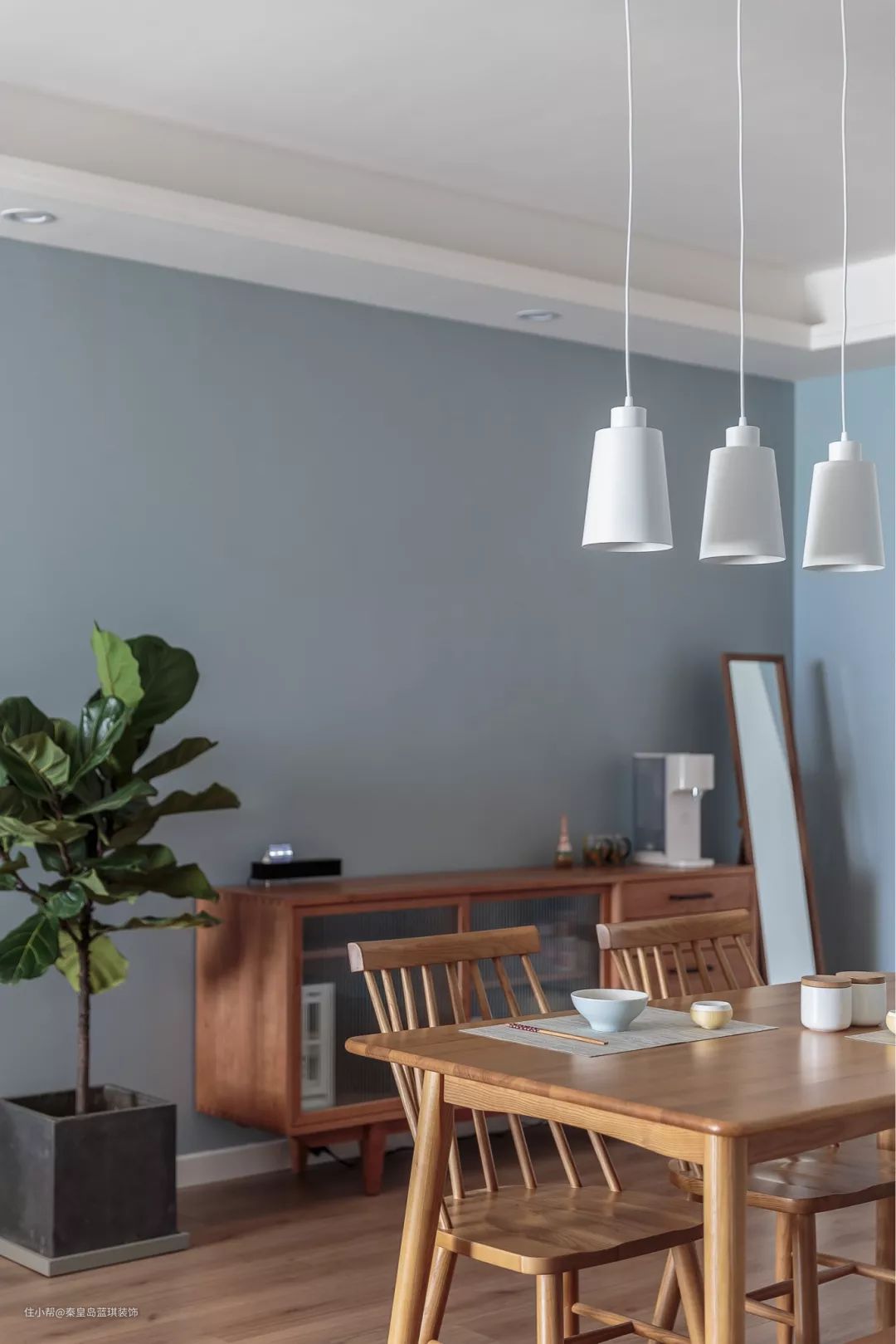 木质餐边柜,旁边还有一盆水泥盆琴叶榕,简单的布置带来实用文艺的气质。