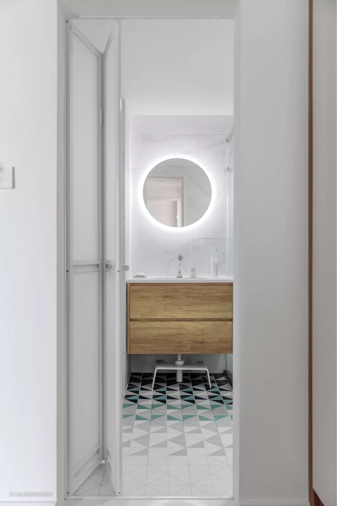卫生间地面以灰白青三色拼接的三角图案地砖,铺贴出一个充满立体感的画面,结合雅白的墙面砖,木质洗手盆柜+圆形背光镜面,呈现出舒适温馨的画面感。