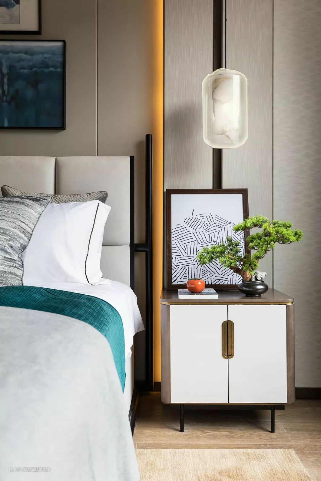 主卧空间设计,带有简欧风的清新雅致,富有传统韵味的细节装饰让空间更添几分沉凝意蕴,一抹中式黛绿焕发空间的生命气息,带有海水纹路的自然系地毯,让人产生漫步沙滩的遐想。