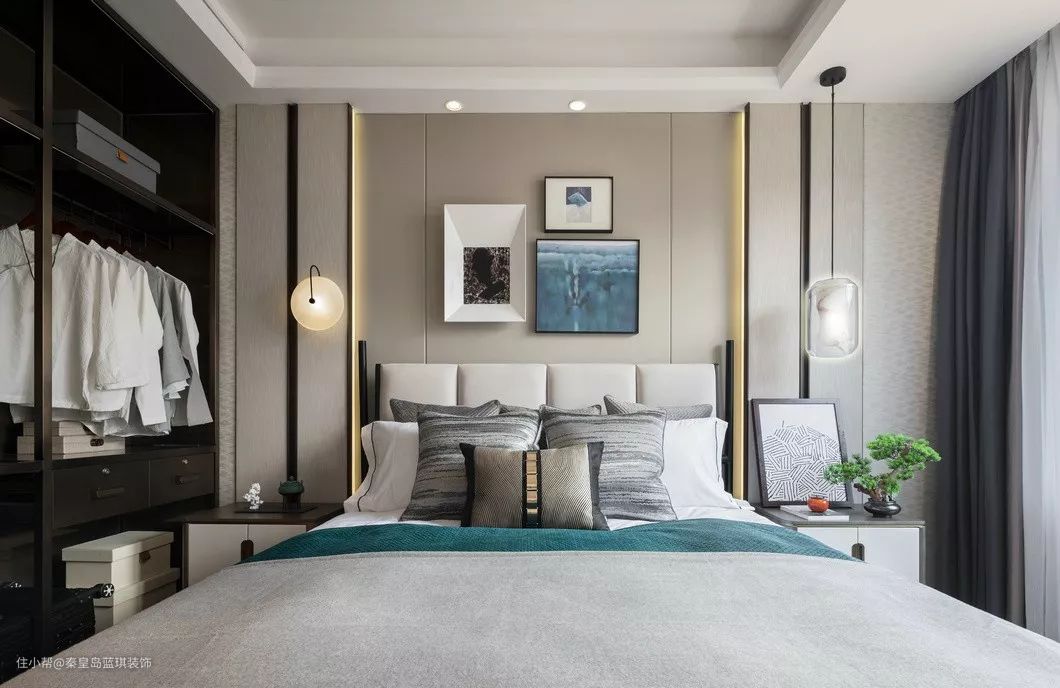 次卧整体呈现出素雅的风貌,温和的米色、浅灰,清雅的软包陈设,共同营造出家的简约、舒怡感。