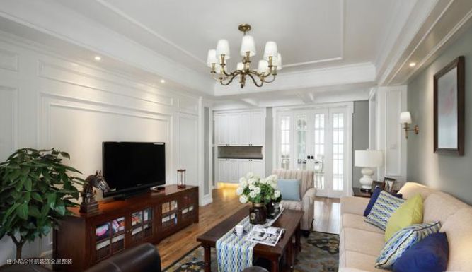 第十一款:这款美式依旧如此,成品电视柜,精致的木饰面设计,不摆放电视机,也有自己独特的美感。摆上电视机,也能很好融入背景设计里。