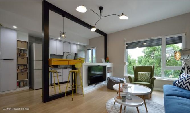 第三款:非常特色的一款电视背景墙,利用背景墙将厨房与客厅区分,即是吧台、西厨区,又是观影区。不过此款适合看电视频率不高的家庭,偶尔利用懒人沙发看电视打发时间。