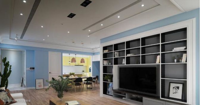 第一款:现代原木风,将电视柜做成封闭式收纳柜,留小部分作开放式,保持原木清爽视感 。在大空间内,不适合将电视柜做成大面积开放式,第一收纳空间未必短时间能利用完,第二暴露的物品太多,会显得空间杂乱无章,降低空间美感。