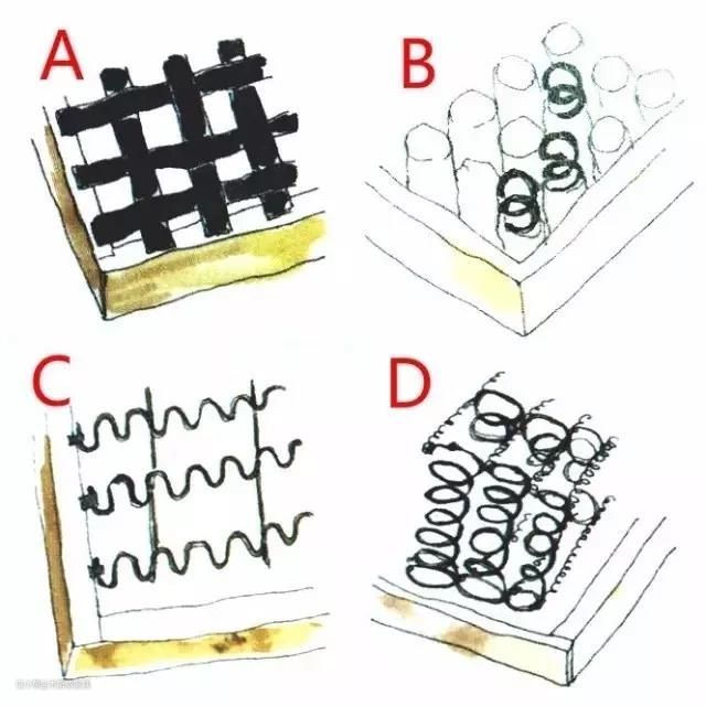 最好的是B独立筒弹簧,可以很好地分散人体的重量,带来安稳舒适感,而橡胶绷带则最便宜,也用的最广泛,但使用寿命短,易出现塌陷。
