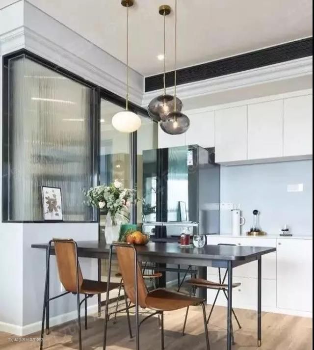 餐厅和厨房之间的墙砌长虹玻璃,半墙的设计既提亮空间,又颜值高。