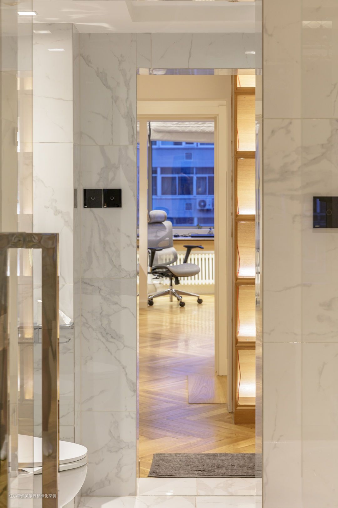 开合方式采用了平开门以及抽拉式,过道尽头连着开放式书柜,每一层安装灯带来增加氛围感。
