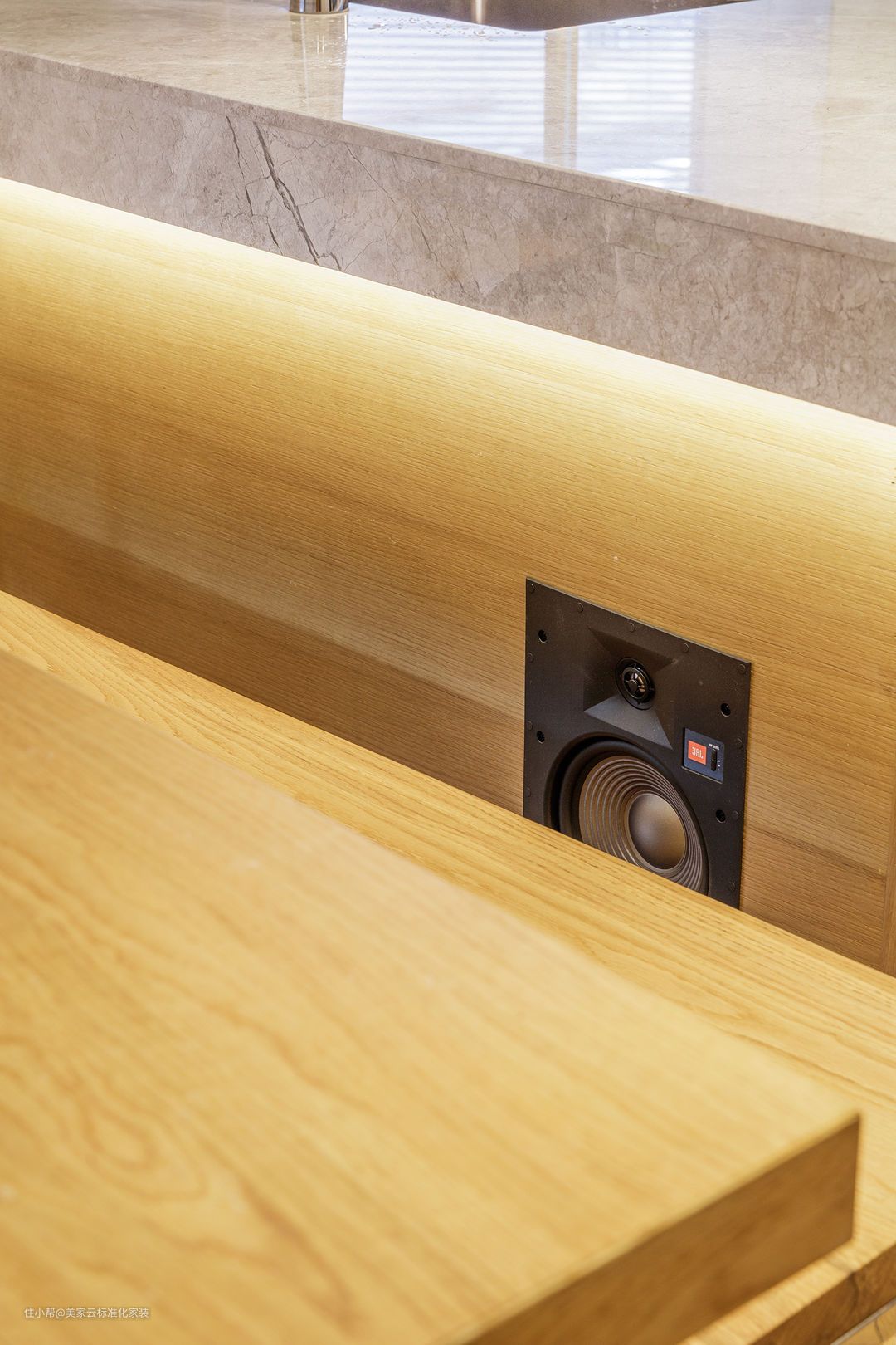 除此之外,为了提升观影质量,厨房中岛的底部还安置了嵌入式音箱,设计时预留好洞口和线缆,安装和维修都很方便。