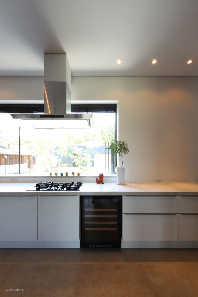 在入口上方约4米宽的凸窗上,可以欣赏外面美丽的景色。通过在窗户侧的橱柜上使用一面质感极高的白色镜面门,厨房既明亮又干净。