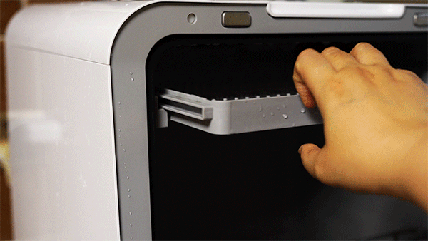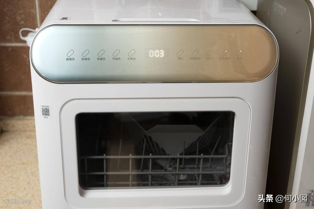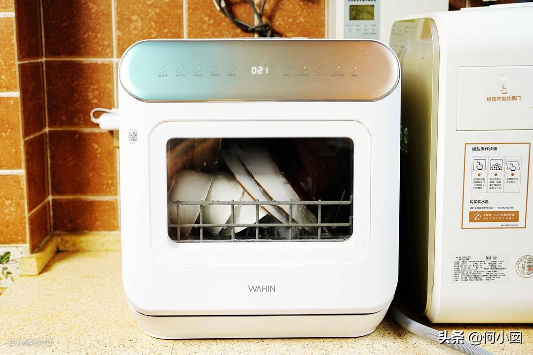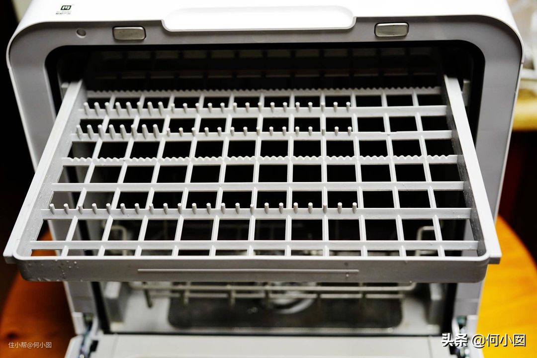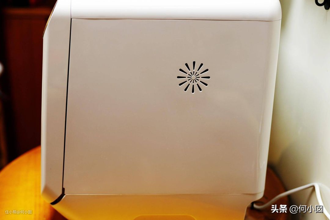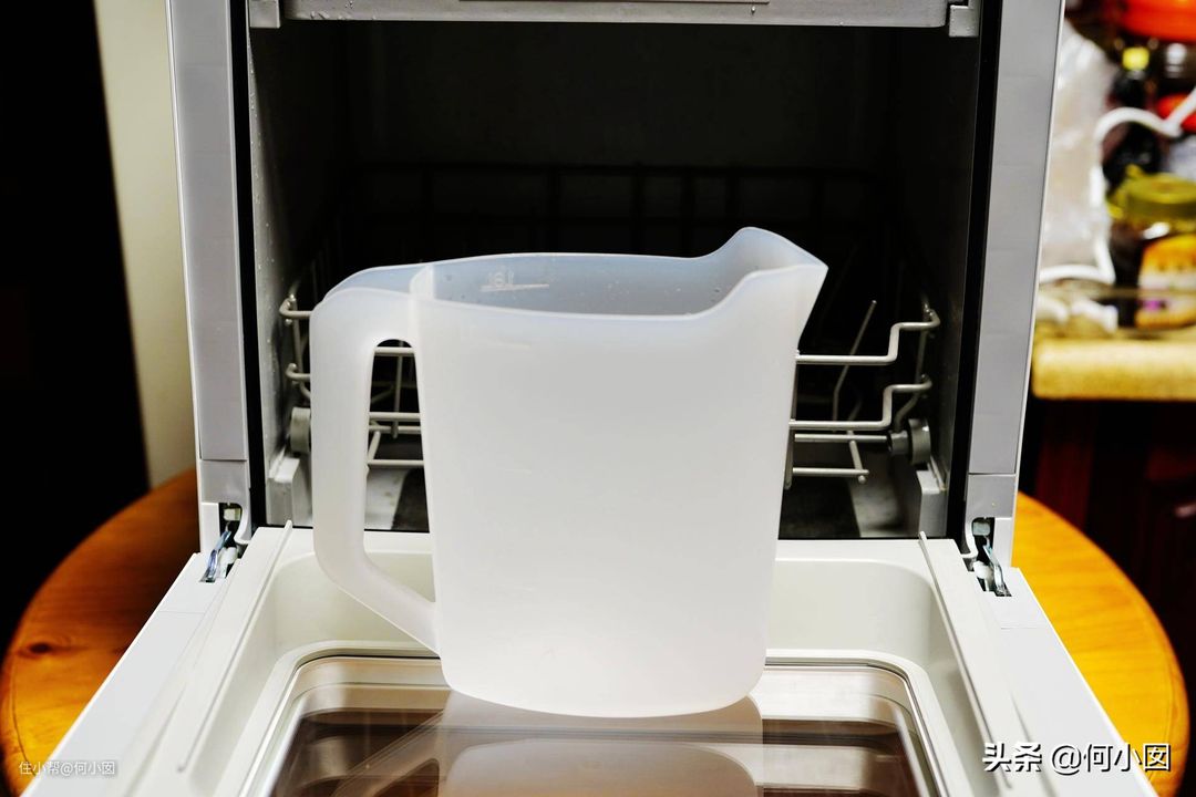 你可以摆放在餐边柜上,摆放在洗衣机上,摆放在橱柜台面上,甚至可以放在办公室的会议室里面用来作为会议后洗十来个人的茶杯使用,既然不需要安装,怎么进水和排水呢?它自带5L的水箱,标配了一个大水壶,实测大约3壶半可以加满水箱水,比较智能的是,加满水的时候会蜂鸣提示我们水加满了哦