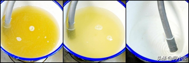 一次程序消耗5L的水,分成三部分来洗涤,我用盆子把废水盛起来,比对看看,从左到右分别是第一次,很脏,第二次已经比较干净了,第三次,全部是清水,洗一次小龙虾使用水果洗一共花费12分钟,是切切实实的洗的很干净了