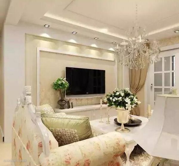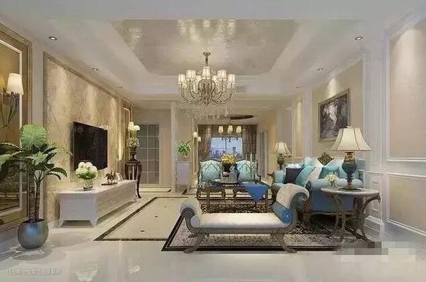欧式装修需要的就是大气,吊顶+吊灯+瓷砖铺贴+背景墙,再配上欧式家具整个客厅变得很好看。